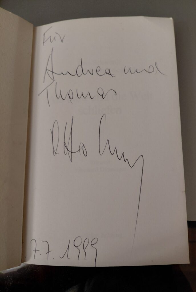 Otto Schwerdts Werk „Als Gott und die Welt Schliefen“ mit einer persönlichen Widmung für die „Omas“-Mitglieder Andrea und Thomas sowie das Mahnmal in Passau bei Nacht.